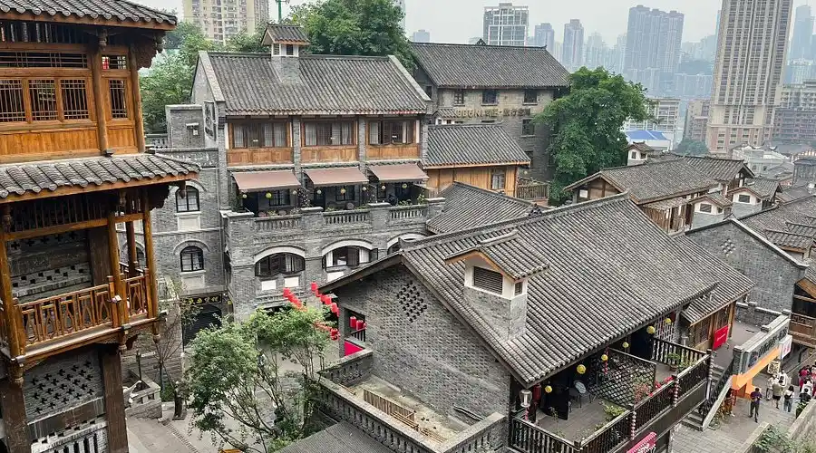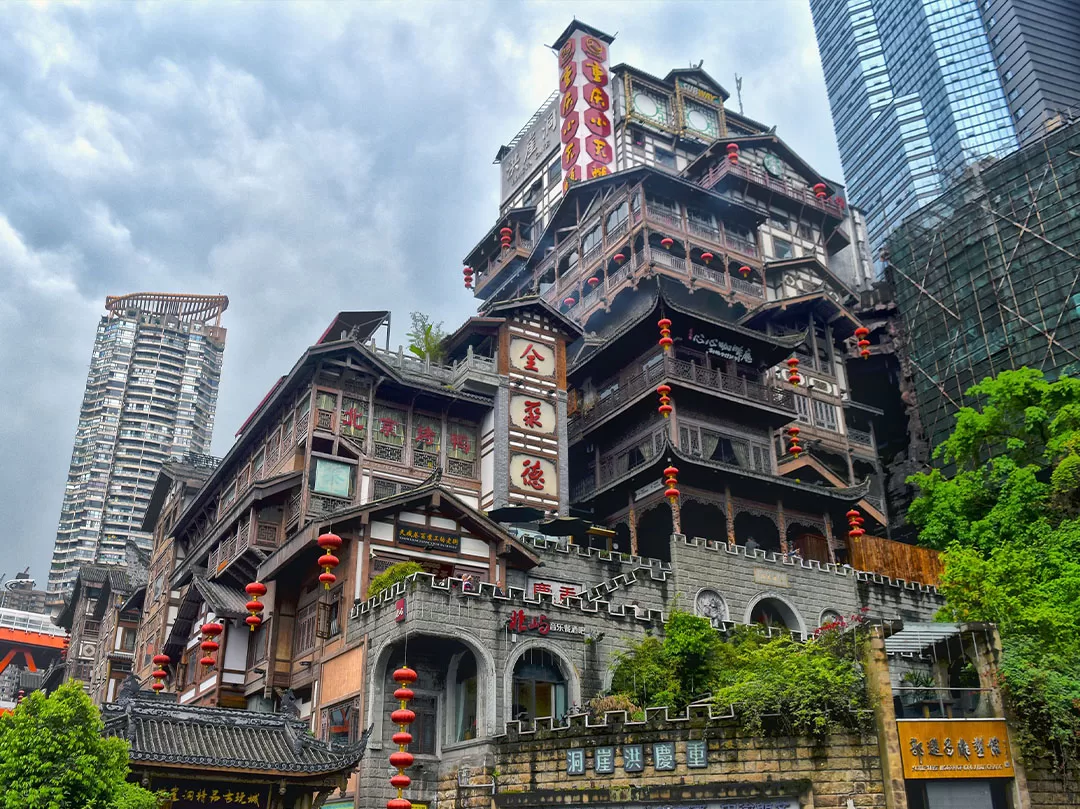 - Cuối cùng, dừng chân tại Hồng Nhai Động - khu phố cổ mang đâmh phong cách nhà sàn truyền thống của vùng Ba Du. Khu phố cổ 11 tầng lầu với mái ngói rêu phong, hoa văn chạm trổ, phía sau là những tòa nhà chọc trời, nằm ở khu trung tâm thương mại thành phố Trùng Khánh, bên bờ sông Dương Tử, là điểm bờ sông giao nhau của hai con sông Trường Giang và sông Gia Linh. Thời gian bật đèn thường vào khoảng 19:00–20:00 (thay đổi tùy mùa). Khi ánh đèn rực sáng, nơi đây như đưa bạn bước vào thế giới huyền ảo tựa như bộ phim “Vùng đất linh hồn”.
